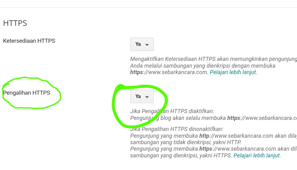 Kemungkinan langkah nomor 2 atau langkah menunggu tombol pengalihan https bisa diubah menjadi YA bisa saja membutuhkan waktu yang lebih cepat ataupun lebih lama tergantung dari bloggernya sendiri Saya juga tidak bisa memprediksi Jadi anda bisa cek setiap saat untuk memastikan bahwa pengalihan https ini sudah dapat diaktifkan secepatnya
