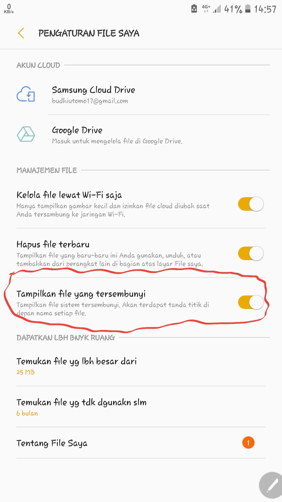 2.Kemudian Buka aplikasi File Manager bawaan smartphone Android kalian Kalau di Samsung nama aplikasinya adalah file saya, namun sebelumnya perlu kamu setting terlebih dahulu supaya file dengan awalan titik bisa kita lihat, caranya klik icon titik tiga yang berada di pojok kanan atas, kemudian klik Pengaturan, setelah itu aktifkan fitur Tampilkan file tersembunyi.