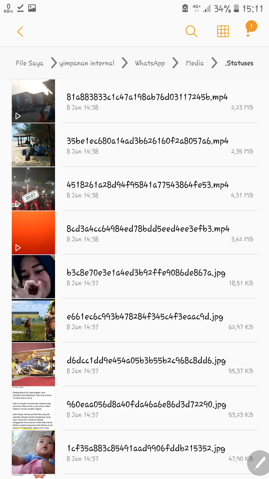 3. Setelah langkah nomor 2 berhasil anda lakukan silakan buka penyimpanan internal buka folder WhatsApp/ Media/.statuses/ Nah di sini ada akan menemukan story story yang sebelumnya sudah pernah Anda lihat jadi tinggal Anda pindahkan atau menyalin nya saja ke folder lain ini bertujuan agar story-nya terdeteksi di galeri