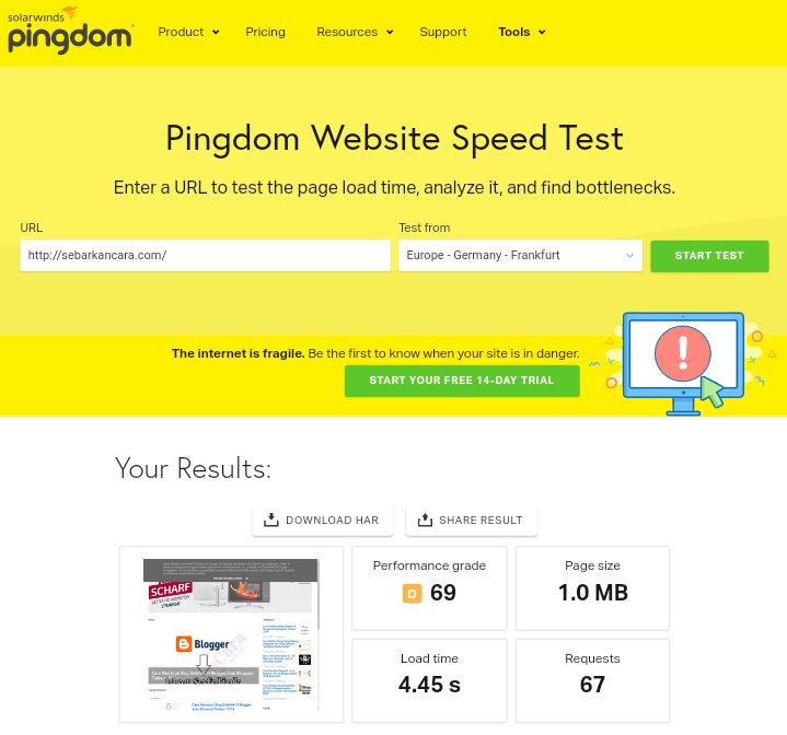 Situs ini juga menyediakan analisis kecepatan loading sebuah website atau blog secara gratis, kita juga dapat memilih server tempat pengetesan kecepatan, setelah pengetesan loading kecepatan blog atau website anda sudah selesai situs ini akan menampilkan nilai pada situs anda dan juga detail yang membuat blog anda Loadingnya lambat, untuk cara penggunaannya masih sama dengan situs-situs yang sudah saya Sebutkan sebelumnya silahkan kunjungi website https://tools.pingdom.com/ kemudian masukkan url blog anda dan klik start test tunggu sampai prosesnya selesai.
