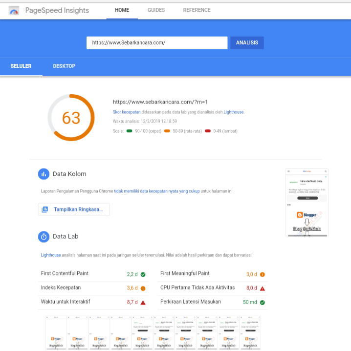 Untuk cara penggunaannya sendiri silakan kamu kunjungi URL kemudian paste-kan url blog atau website kamu di kolom yang sudah disediakan, setelah itu klik analisis nanti Mbah Google akan menilai kecepatan loading website Anda secara akurat beserta detail-detail yang membuat blog anda loading lambat