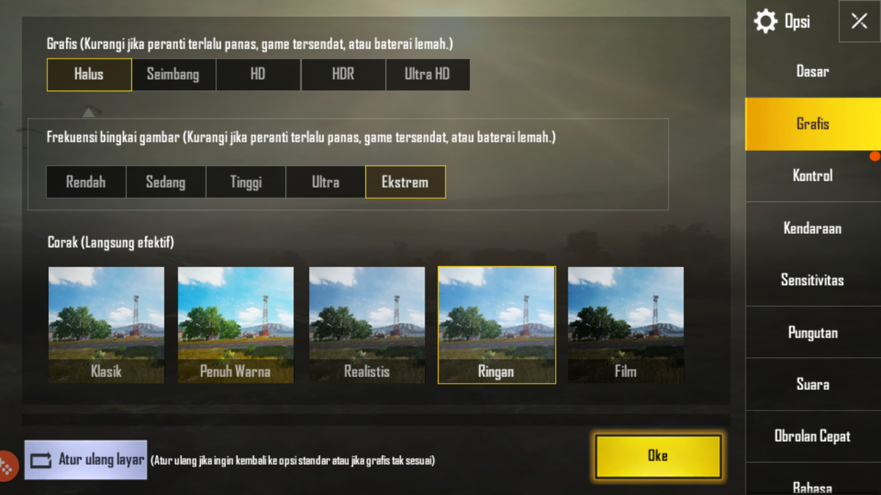 Setelah game pubg kalian terbuka kemudian pergi ke pengaturan grafis game pubg anda dan ubah frame ratenya menjadi extreme atau juga dalam bahasa Indonesianya menu ini bernama frekuensi bingkai gambar setelah itu save dan rasakan perubahannya