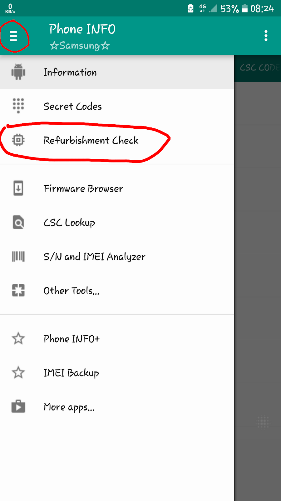 2. Setelah itu klik kiri atas yang saya lingkari kemudian Click refurbishment check dan nanti aplikasi akan loading mengechek kondisi hp anda