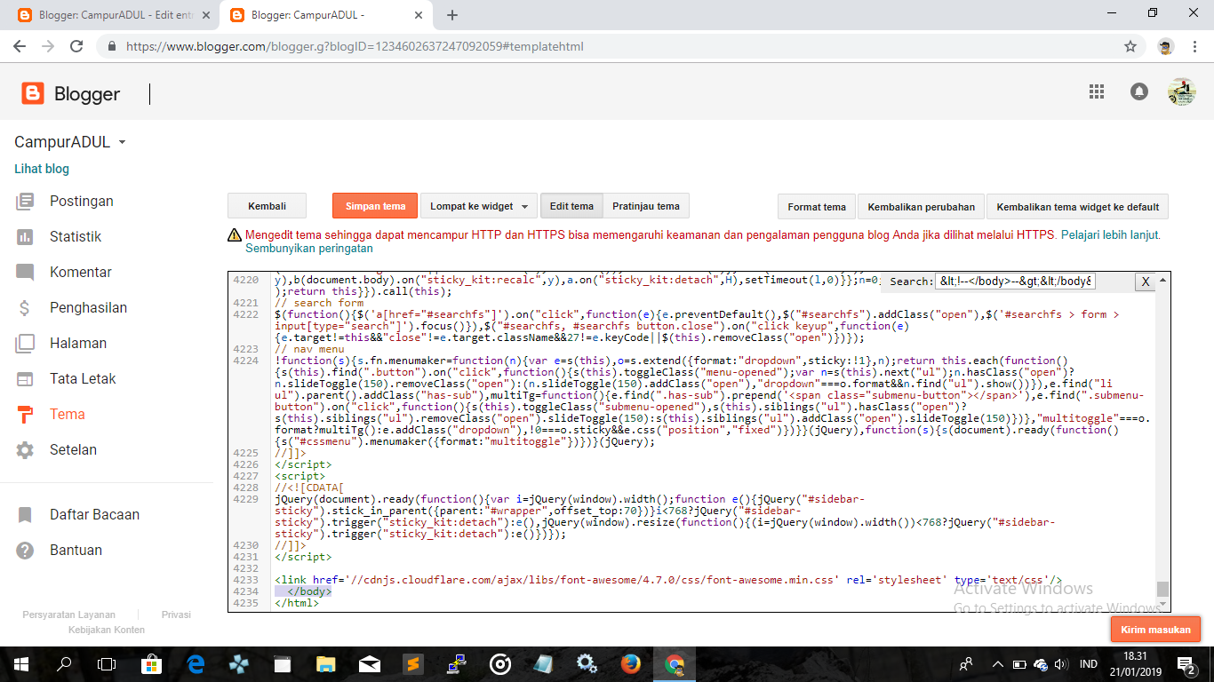 1. Langkah pertama apabila anda memiliki komputer langsung saja anda pergi ke editor tema anda kemudian tekan ctrl + F dan cari kode <!--