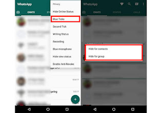 - Setelah itu kamu bisa pilih ingin centang satu di chat Kontak atau Chat group, pilih saja salah satu, dengan cara pilih Hide For Contacts atau Hide For Groups
