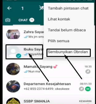 - Pilih nomer yang ingin di sembunyikan dari obrolan pesan