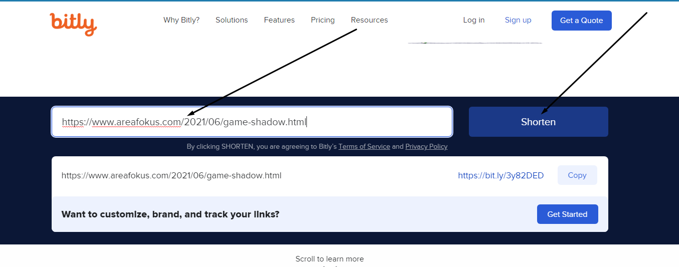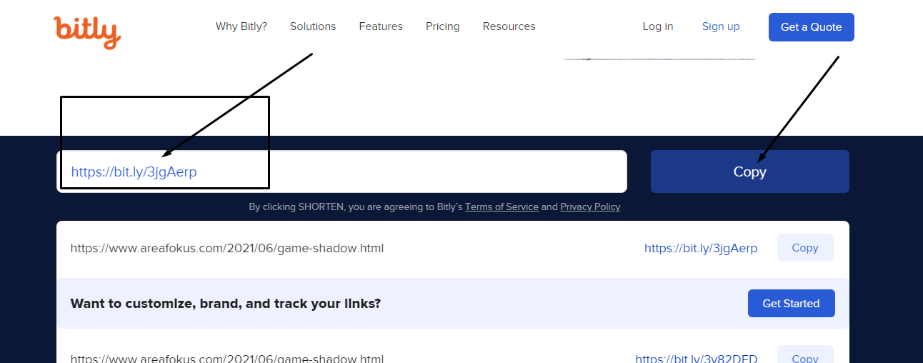 2.Shobat copy lalu pastekan kode di atas tadi di Bitly, kemudian klik "Shorten" lalu tekan "Copy", tinggal pastekan di sosial media yang shobat inginkan, kode panjang tadi sudah menjadi link pendek.